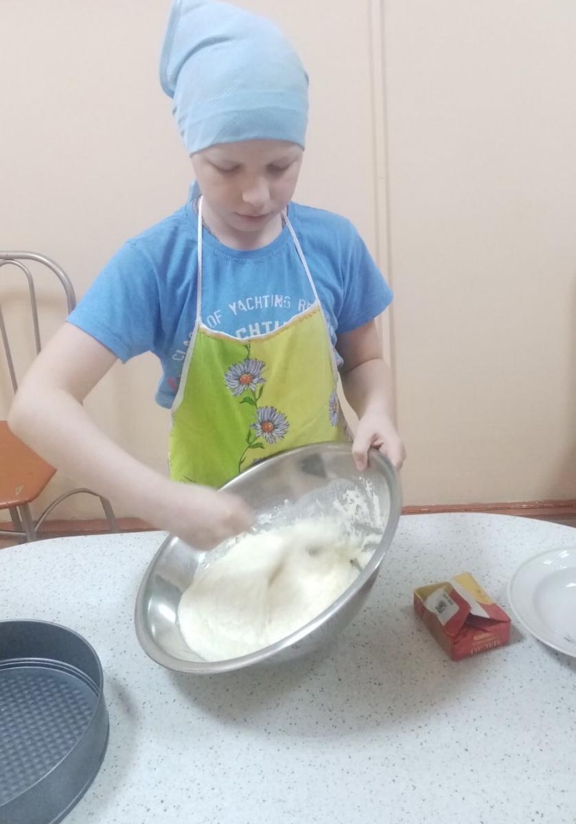 Ребята познакомились с ингредиентами, изучили пошаговую инструкцию приготовления торта учились заводить тесто, и вот противень .наполнена содержимым теста, в духовку на 30 минут и «Манник» готов)